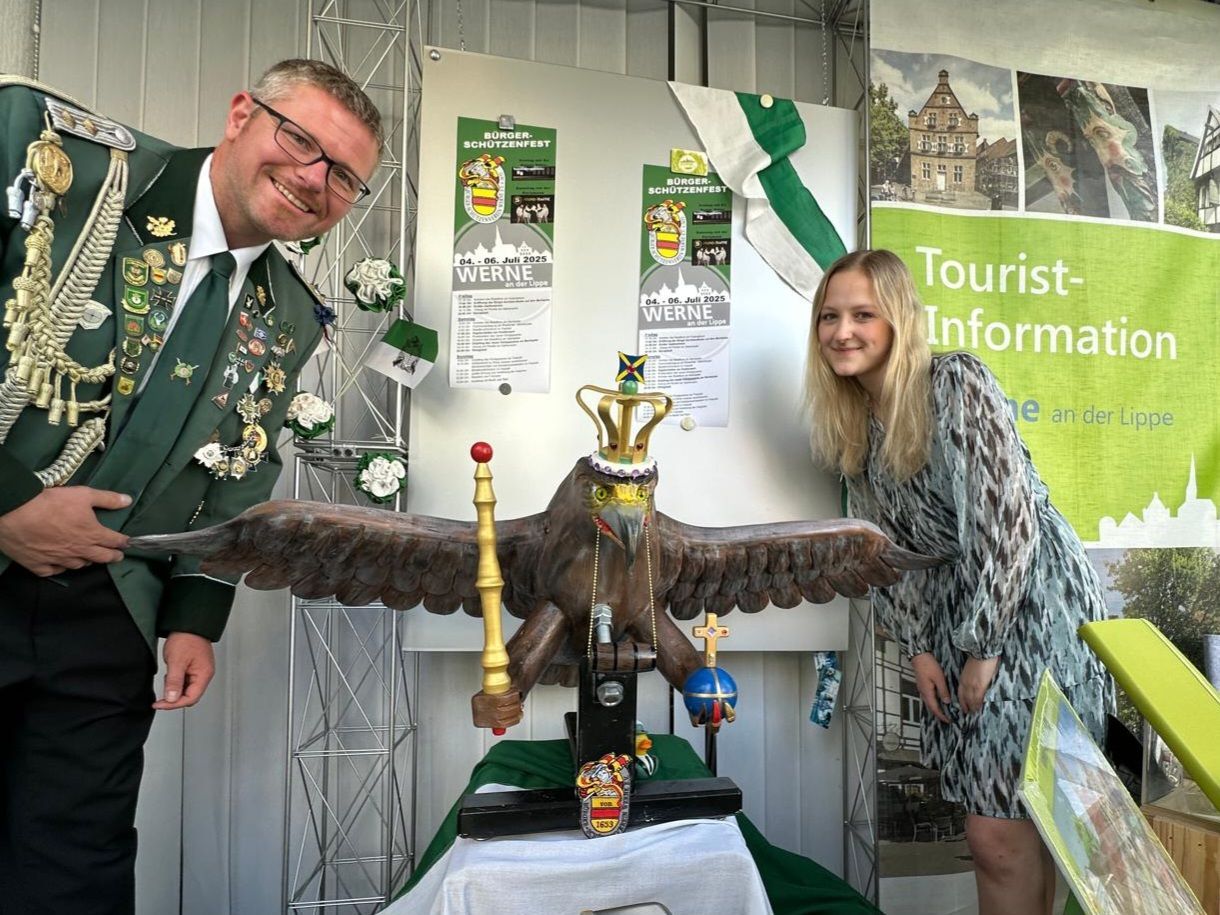 Das Bürger-Schützenfest vom 04. bis 06. Juli 2025 wirft seine Schatten voraus. Und daher präsentieren die Bürger-Schützen ihren Vogel Marco "Klausi" Klaus nun auch der Werner Bevölkerung. Seit einigen Tagen ist der Vogel, der dem Verein in 3 Wochen einen neuen König bringen wird, in der Tourist-Info Werne am Markt 19 zu bewundern. Vertreter des Vereins stellten zusammen mit der Namenspatin Lena Röll den Vogel im Schaufenster aus. Ebenso kann man sich dort vorab schon über das Festprogramm informieren.