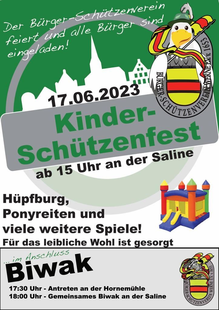 Das nächste Kinderschützenfest wird wieder am 27.April 2024 an der Saline stattfinden. Hierzu sind alle Bürger und Familien angesprochen, einen schönen Tag an der Saline, mit buntem Rahmenprogramm, zu verbringen. Im Anschluss an das Kinderschützenfest, wird an gleicher Stelle ab ca. 18.00 Uhr das Salinenfest gefeiert.